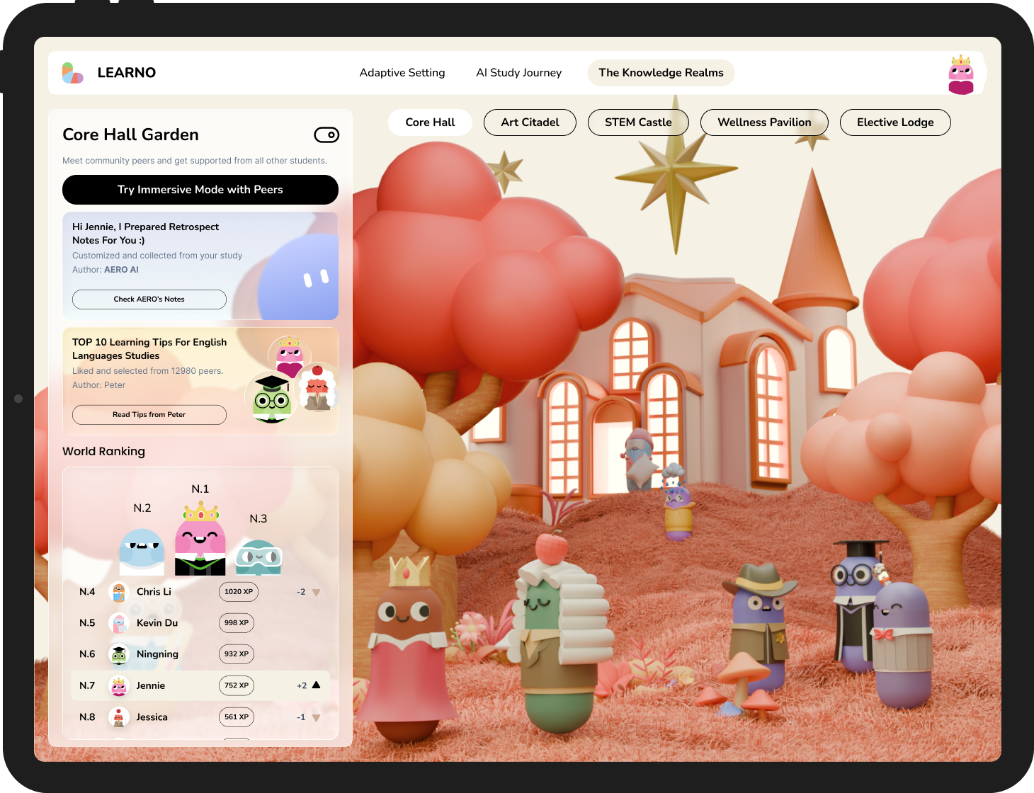 Learno represents each subject as a distinct realm, progressing at its own pace based on individual learning patterns. This approach emphasizes personalized growth rather than uniform advancement.
