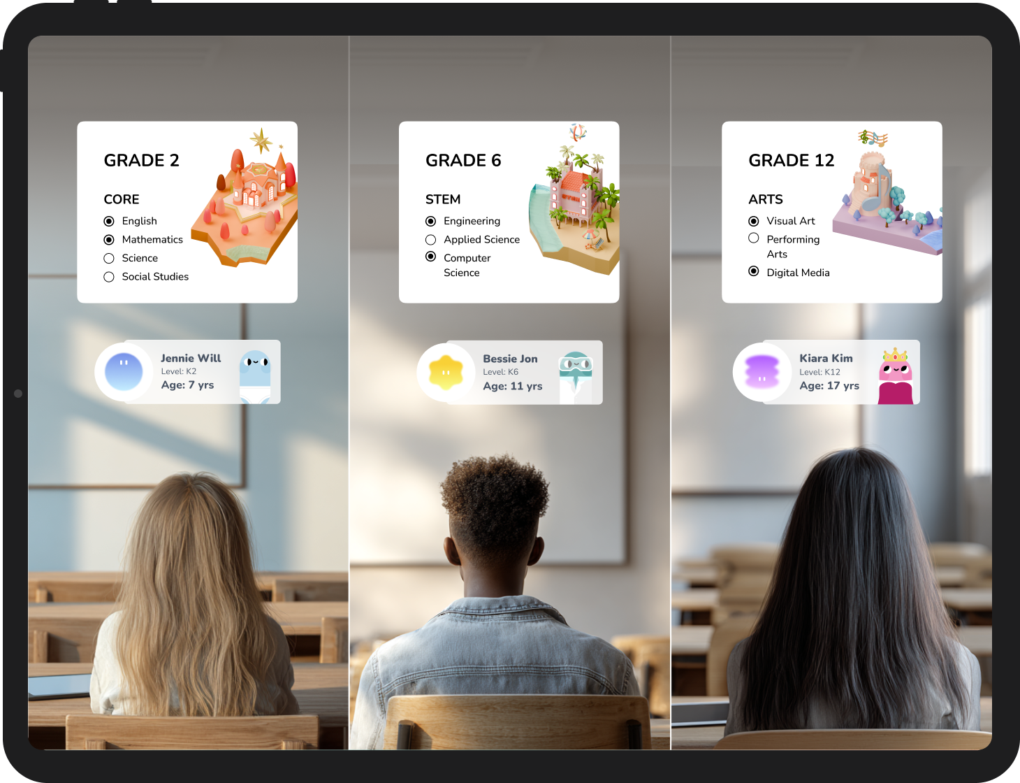 Characters adapt to represent learners across different age groups, ensuring visual relevance and inclusivity. This approach helps learners see themselves reflected in the experience, strengthening relatability and long-term engagement.