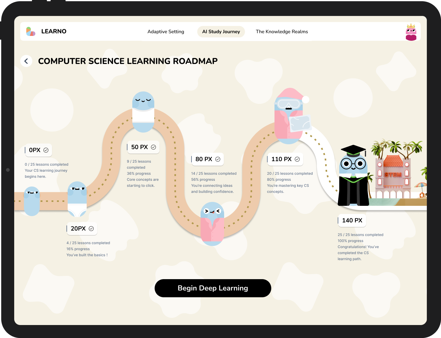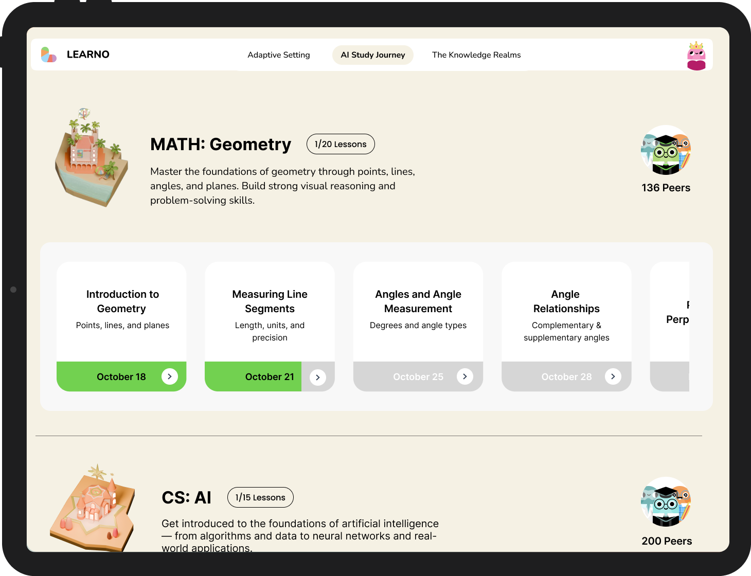 Learno organizes learning content into an AI-tailored, holistic study journey that clearly structures subjects, lessons, and progression. This approach helps learners understand their path toward mastery while reducing cognitive overload and supporting sustained engagement.